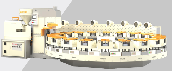 圓盤式內注連幫注射成型機:雙人協作(1人取楦,1人套幫)就可做鞋,全自動開合模,高效又省力!
