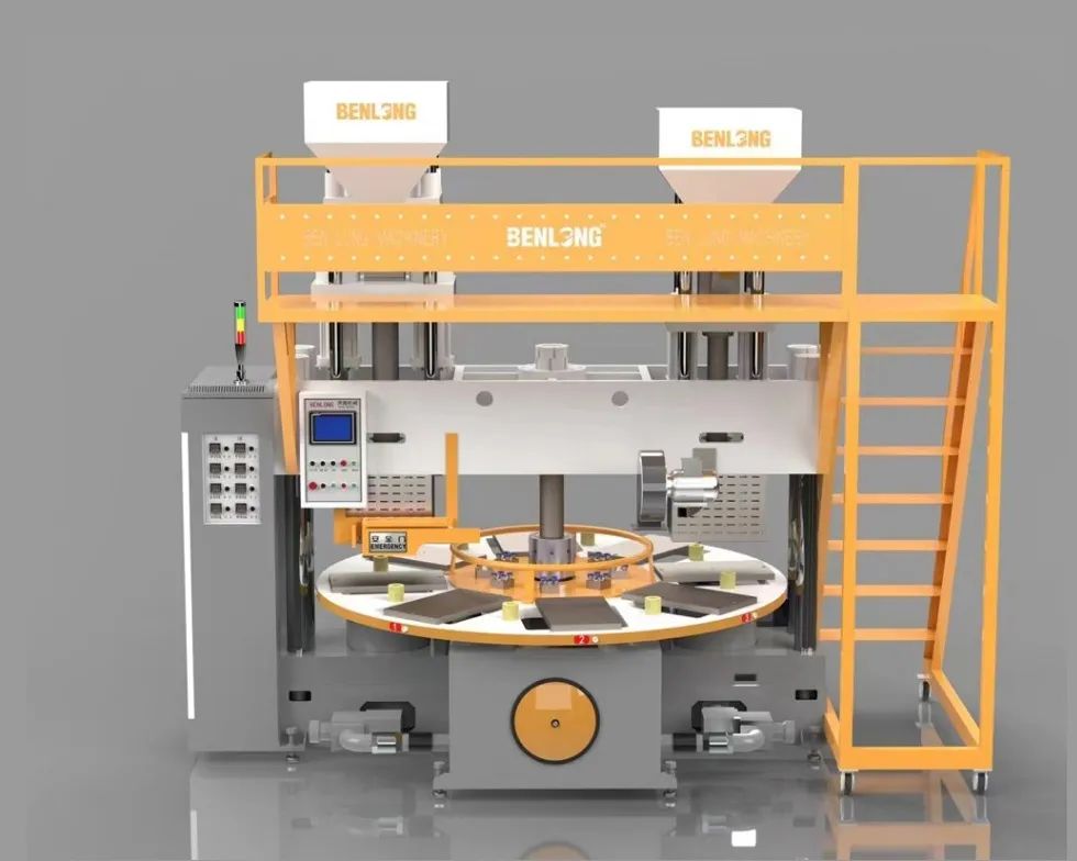 圓盤立體布局:采用圓盤狀旋轉工作臺,可同時安裝多組模具,通過工位循環(上料、注射、冷卻、脫模)實現連續生產,大幅提升單位時間產能,且立體結構節省地面空間,適合集約化廠房規劃。